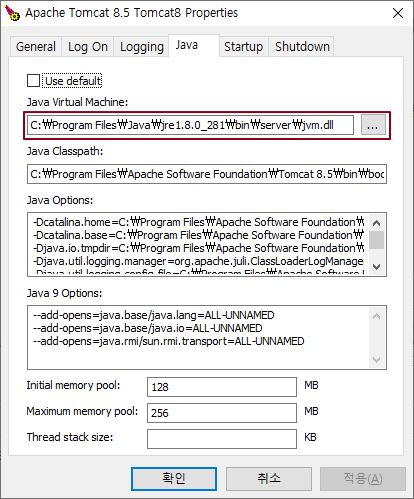 - Java Virtual Machine의 경로를 새로 설치된 Java jre의 bin\server\jvm.dll로 변경후 저장한다.