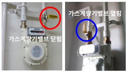 ※ 가스계량기 밸브가 잠김 상태로 봉인되어 있는 경우에는 가스공급업체를 통해 조치 받으세요.