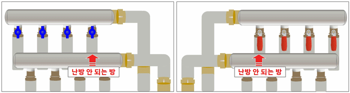3. 난방이 되지 않던 방도 정상적으로 난방이 된다면 난방이 잘되는 방의 분배기 밸브를 절반만 열어주면 균형적인 난방이 가능합니다.