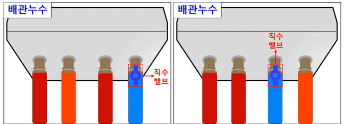 ※ 누수량이 많을 경우 아래 사진을 참고하여 보일러와 연결된 배관 중 직수배관에 밸브를 잠궈 추가 누수가 되지 않도록 조치해 주세요.