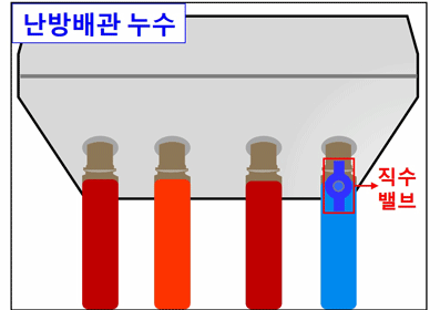 ※ 누수량이 많을 경우 위 사진을 참고하여 보일러와 연결된 배관 중 직수배관에 밸브를 잠궈 추가 누수가 되지 않도록 조치해 주세요.
