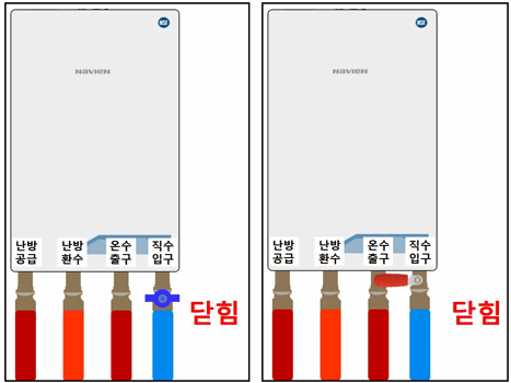 ※ 누수량이 많을 경우 아래 사진을 참고하여 보일러와 연결된 배관 중